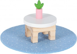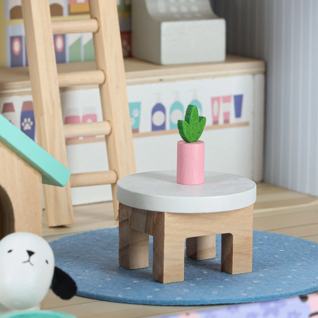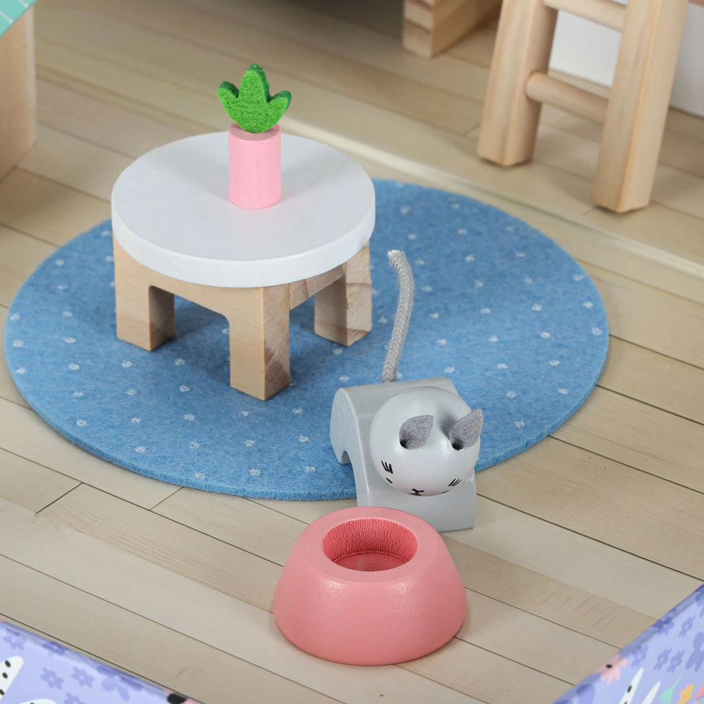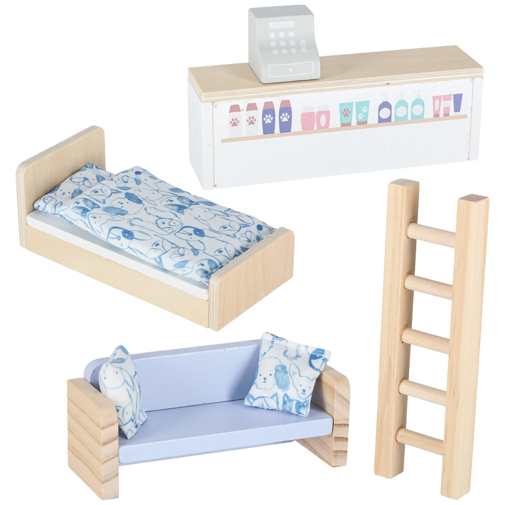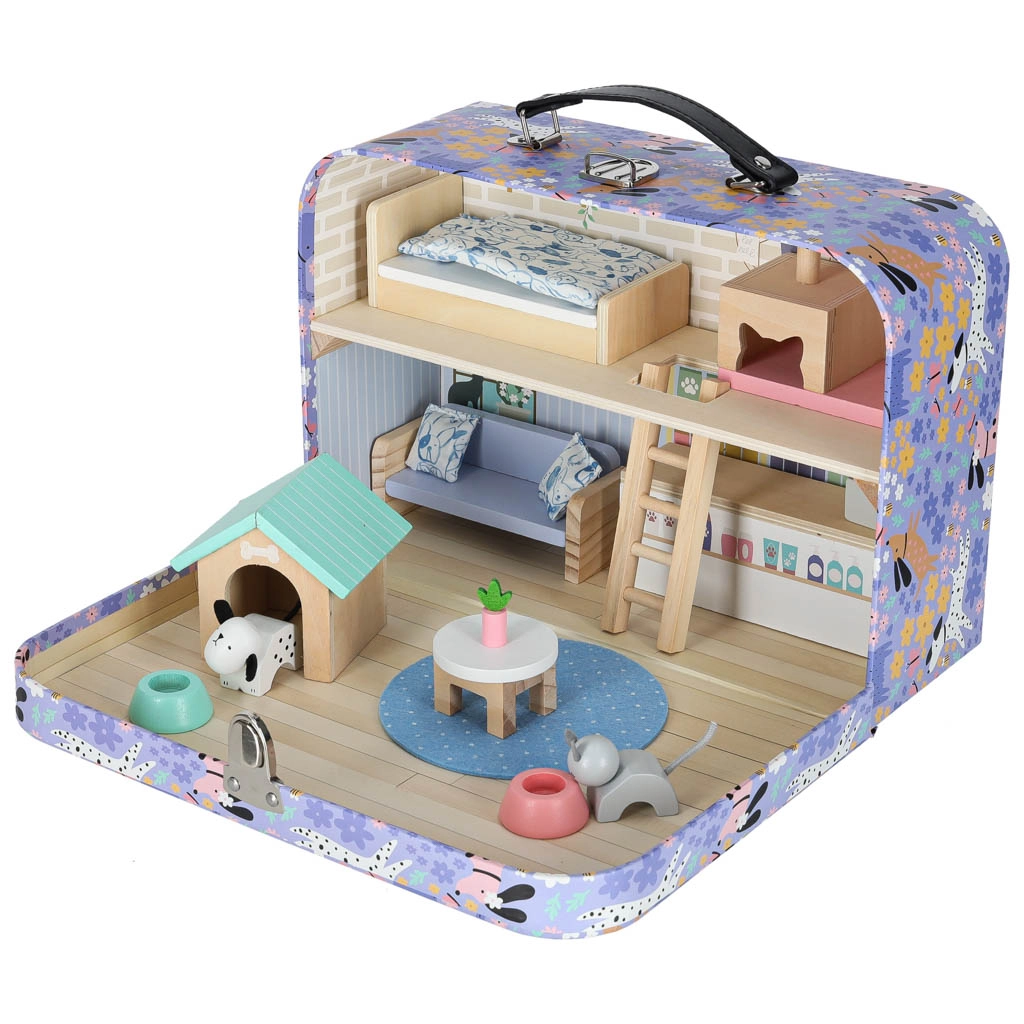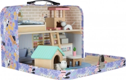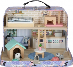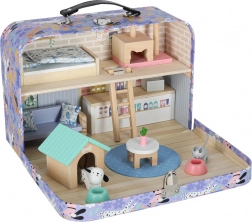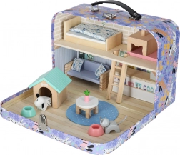 De set bevat kwalitatief houten meubilair (bedje met beddengoed, bank, tafel, plank, ladder), elementen van een winkeltje (toonbank en kassa) en ook een dierenhoek met hondenhok, krabpaal voor de kat en twee voerbakjes. Dankzij het kofferontwerp neem je het speelgoed makkelijk mee op bezoek, op vakantie of naar de speeltuin – en na het spelen ruim je alles snel op.