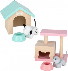 Inclusief figuurtjes van een hondje en een katje, bakjes, een hondenhok en een krabpaal – perfect voor dierenverzorging en rollenspellen.
