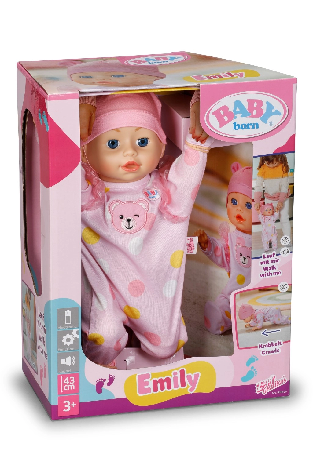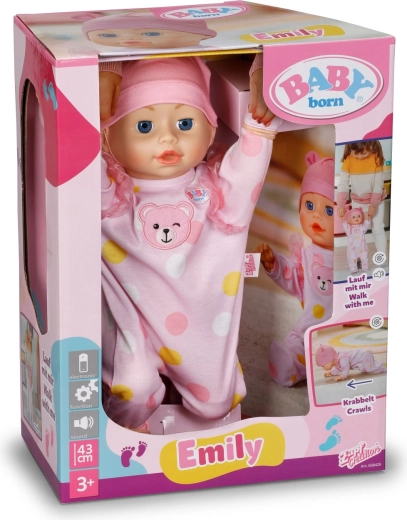 De BABY born Emily pop motiveert kinderen tot beweging en creativiteit – een eenvoudig en veilig mechanisme laat de pop lopen of over de grond kruipen. Zo kunnen kinderen de verzorging van een baby nabootsen, verhalen verzinnen en tegelijk fijne en grove motoriek ontwikkelen.