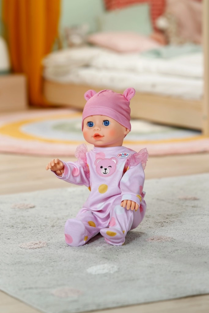 Een superzachte roze onesie met stippen en een mutsje met oortjes geeft het spel een tedere touch.