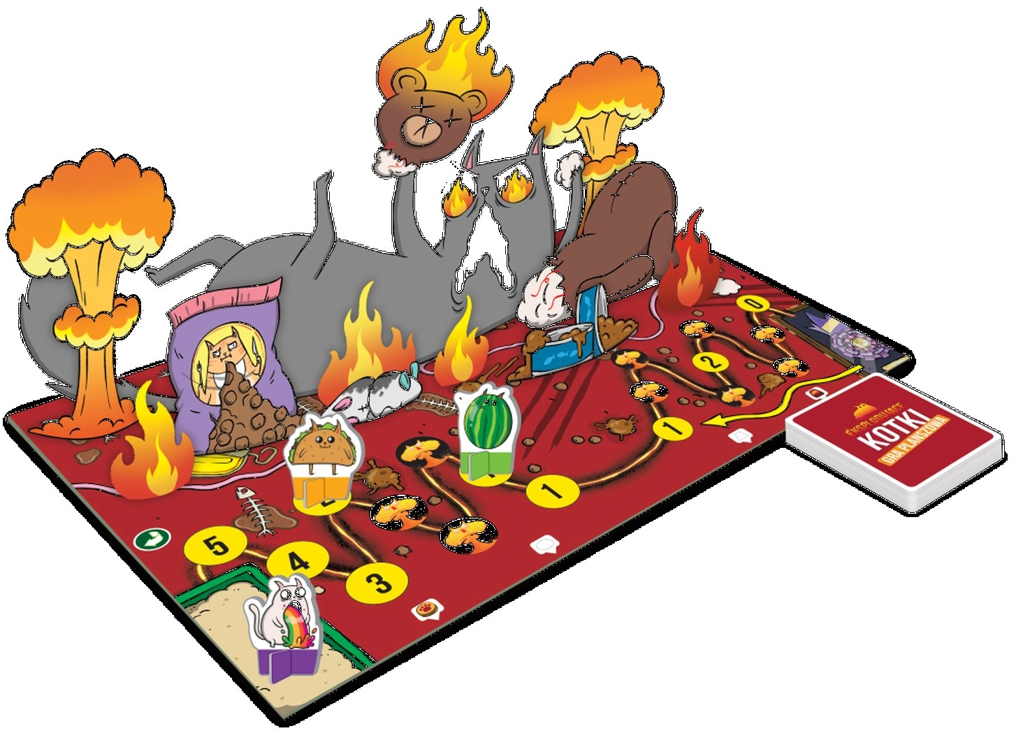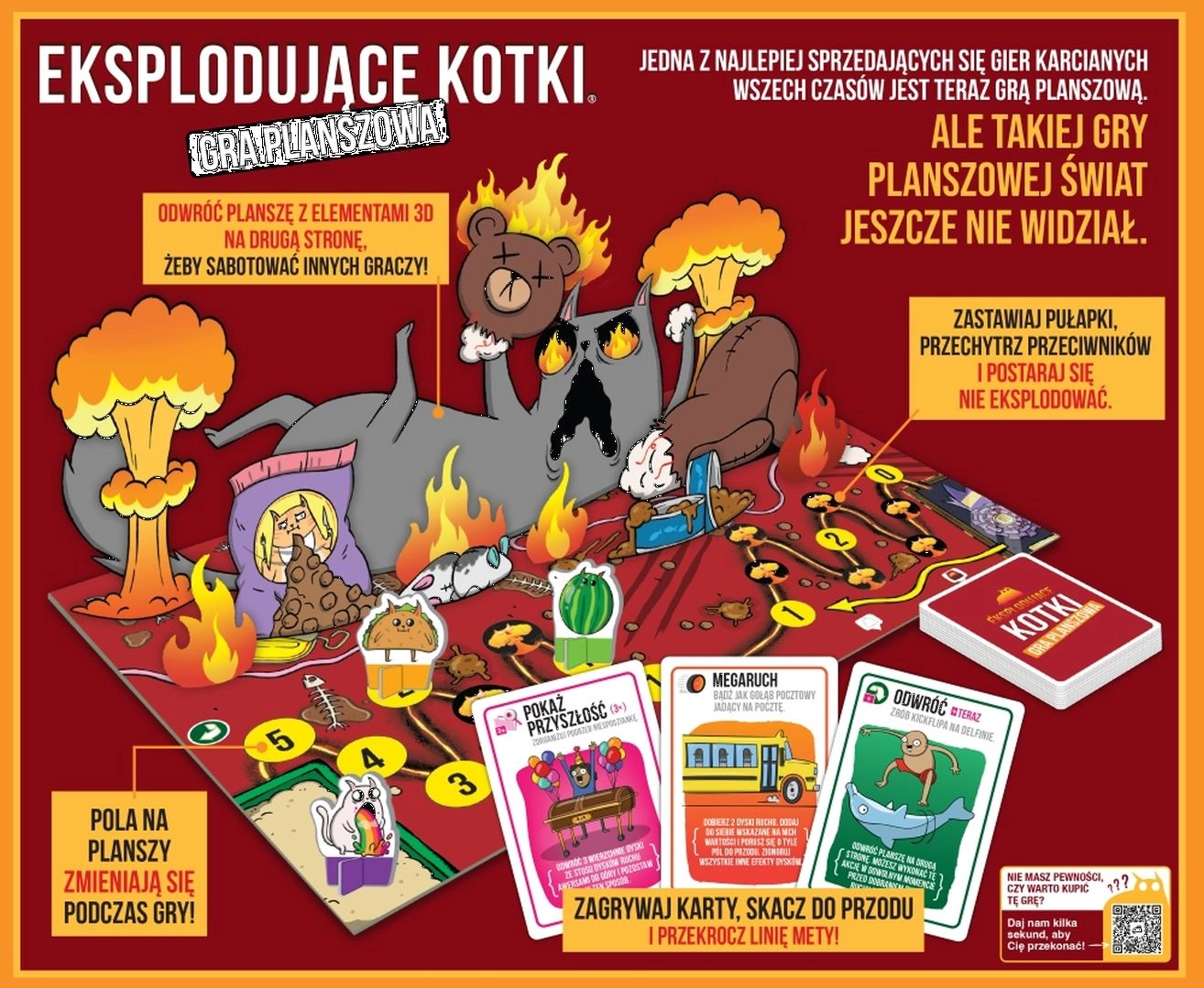 Exploding Kittens: bordspel brengt de chaotische energie van de populaire kaartspelvoorloper naar het speelbord. Spelers wisselen het spelen van actiekaarten en het trekken van bewegingsschijven af om over het spoor te bewegen en het doelveld te bereiken. Onderweg wachten vallen en sabotage door tegenstanders, die je alleen overleeft met slim gebruik van onschadelijk-maak-kaarten.