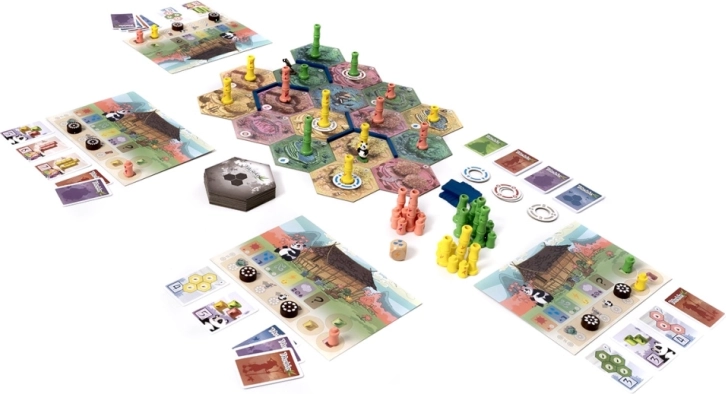 TAKENOKO ECO is een strategisch familiespel waarin spelers kleurrijke bamboetuinen cultiveren en zorgen voor een hongerige panda die aan het Japanse hof is geschonken. In elke beurt kies je acties – je voegt nieuwe tegels toe, bouwt irrigatie, verplaatst de tuinman om bamboe te laten groeien of de panda, die smult van de scheuten. Met slim plannen en het voltooien van doelkaarten verdien je punten.