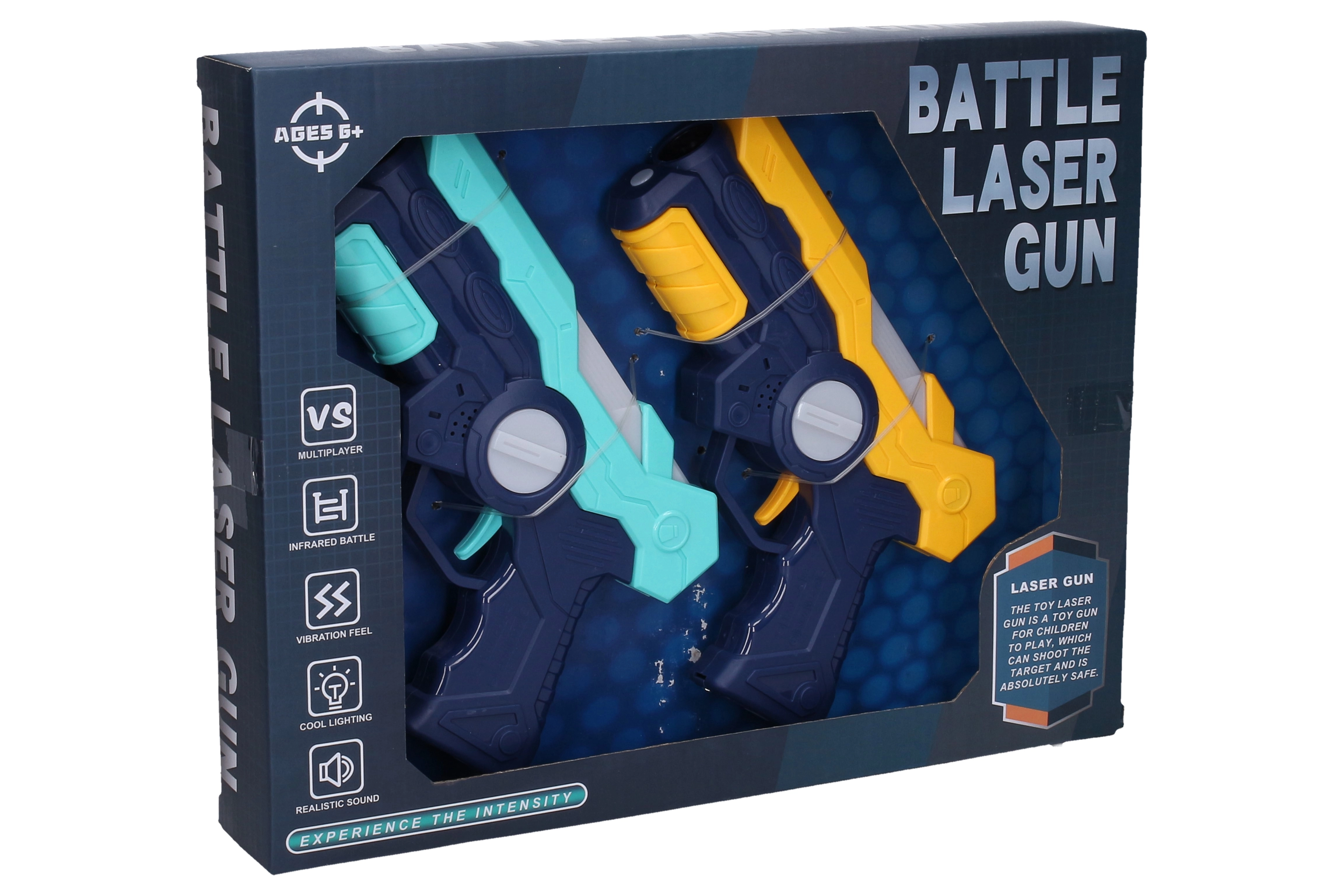 De set van twee laserpistolen is ideaal voor broers en zussen, vrienden en familiestrijden. Het compacte formaat van 20 cm ligt goed in de hand, de opvallende licht- en geluidseffecten verhogen de intensiteit van elk spel, en de overzichtelijke afbeeldingenhandleiding op de achterkant van de verpakking leidt je snel door de installatie en bediening.