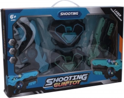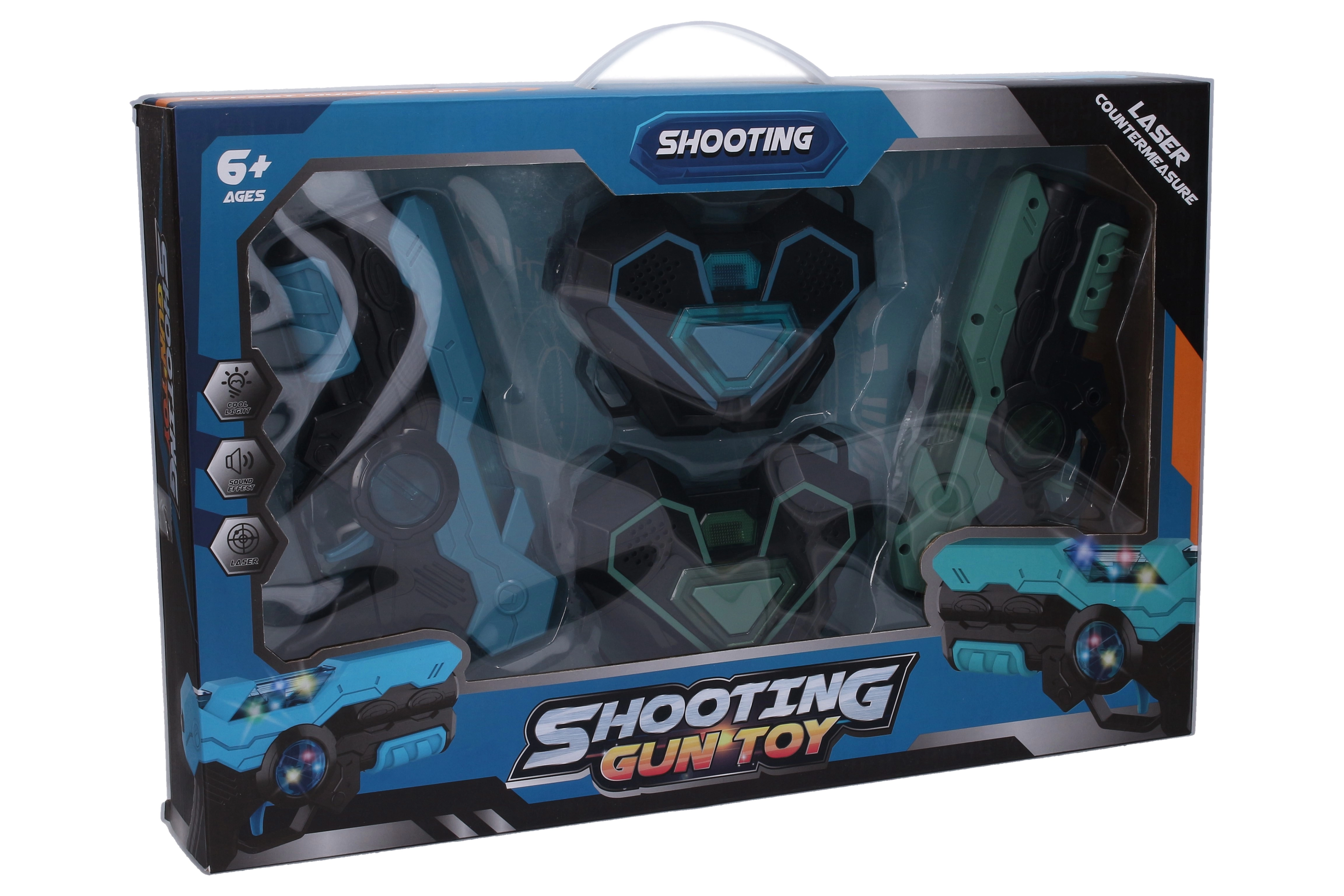 Geniet van actievolle fun binnen en in de tuin met dit laserspel met twee pistolen en twee vesten van circa 20 cm. Dankzij de licht- en geluidseffecten is elke treffer duidelijk en is het spel extra meeslepend. De bediening is intuïtief – activeren via de schakelaar aan de achterzijde van het pistool en herladen met het trekmechanisme onder de loop.