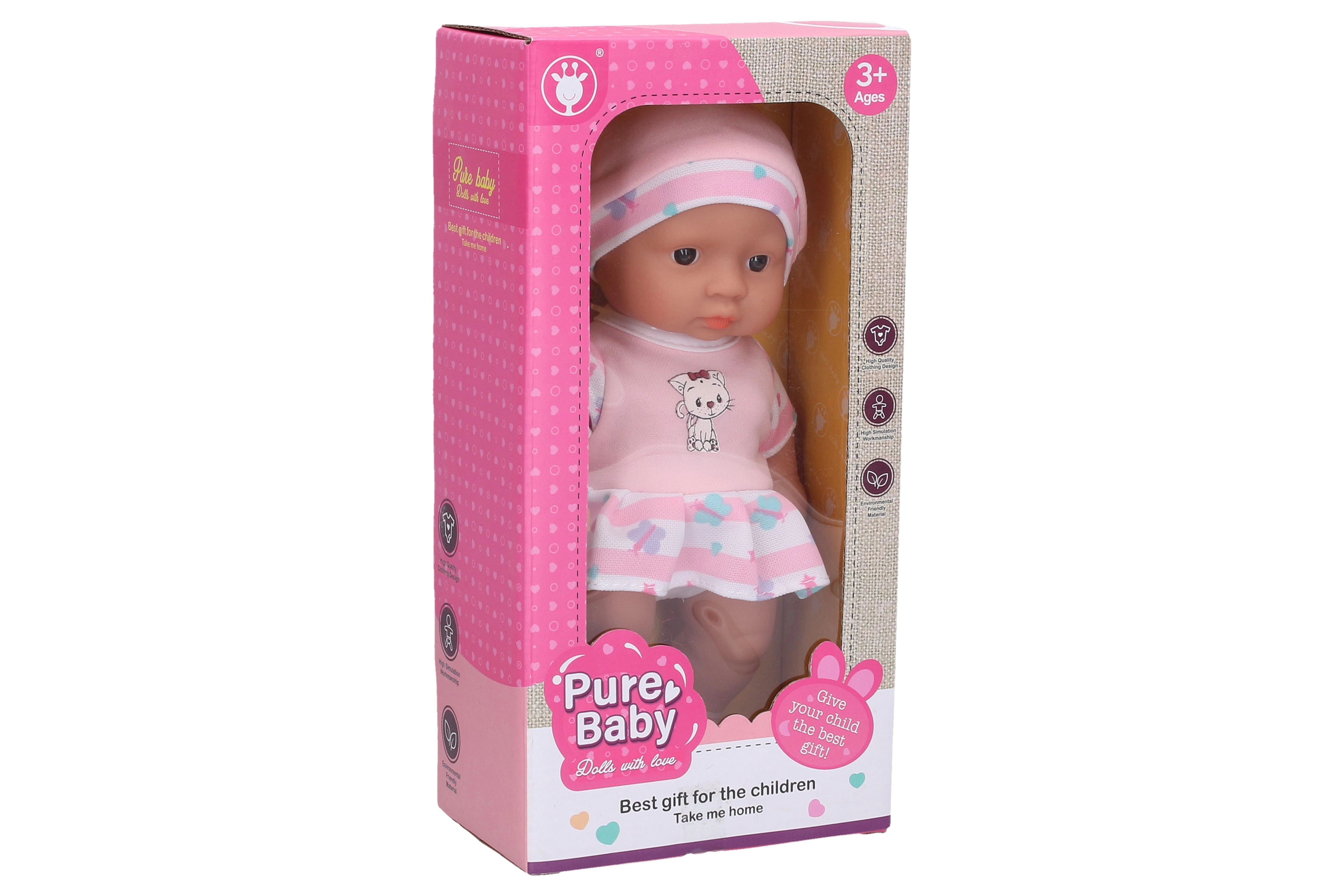 Deze schattige babypop in het roze zorgt voor uren speelplezier. De compacte maat van 22 cm is perfect voor kleine handjes en maakt het eenvoudig om de pop mee te nemen naar de crèche, op bezoek of op reis. De pop stimuleert de ontwikkeling van sociale vaardigheden, zorgzaamheid en verbeeldingskracht.