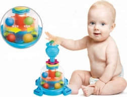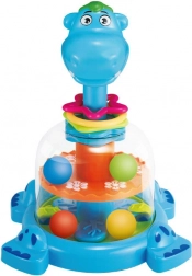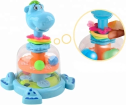 Interactieve tol in de vorm van een nijlpaard trekt de aandacht van kinderen vanaf 12 maanden met zijn kleurrijke uitstraling en beweeglijke balletjes. Bij het indrukken van het hoofdje gaat het binnenwiel draaien en beginnen de balletjes in het buikje te stuiteren. Grote, gemakkelijk vast te pakken elementen, drie schuifbare vormen aan de nek en veilige materialen met CE-certificering en conformiteit met EN71 ondersteunen de fijne motoriek, coördinatie en het leren van kleuren en vormen.