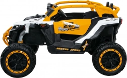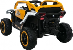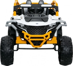 Stijlvolle elektrische kinderauto in geel-witte kleur voor een realistische offroad-rijervaring. Dankzij de 4x4-aandrijving, brede terreinbanden en robuuste constructie ideaal voor spelen in de buitenlucht. LED-verlichting, een stuur met eenvoudige bediening en twee zitplaatsen zorgen voor een veilige en leuke rit voor jonge bestuurders.