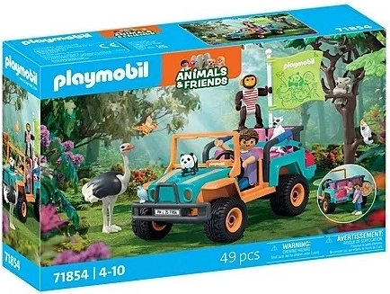 Kleurrijke PLAYMOBIL terreinwagen uit de Animals & Friends serie nodigt kinderen uit voor een avontuurlijke rit door de jungle. In de auto passen vier figuren en er is ook plek voor schattige dieren – panda, maki, koala, struisvogel en kaketoe. Met rijk accessoirespakket, de schaduw van een loofboom en een vogelnest prikkelt het de verbeelding en stimuleert het creatief spel.
