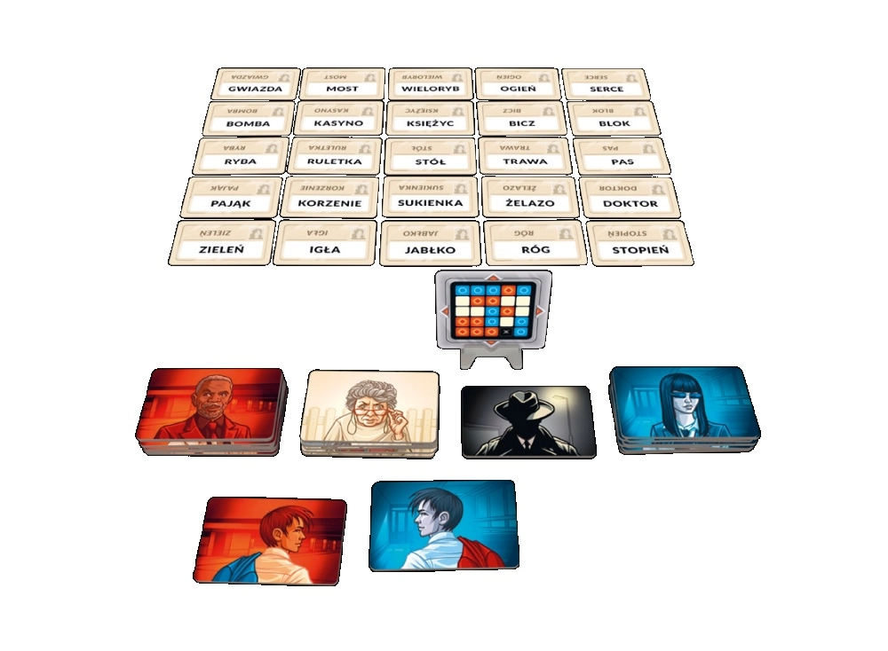 - 16 agentkaarten in 2 kleuren; 1 dubbelagentkaart; 7 kaarten van onschuldige omstanders; 1 moordenaar-kaart; 40 sleutelkaarten; 200 kaarten met 400 codenamen; spelregels; standaard