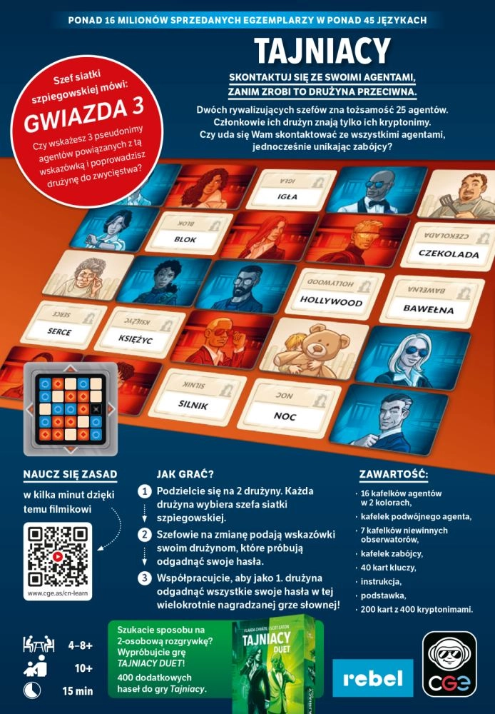 Ontdek het fenomeen van gezelschapsspellen: Tajniaci – een slim teamwoordspel waarin je met eenduidige hints codenamen met elkaar verbindt en de gevaarlijke moordenaar ontwijkt. Het spel biedt snelle rondes van circa 15 minuten, hoge herspeelbaarheid dankzij 400 codenamen en intensieve teamcoöperatie die de creativiteit en het associatief denken van de hele groep test.