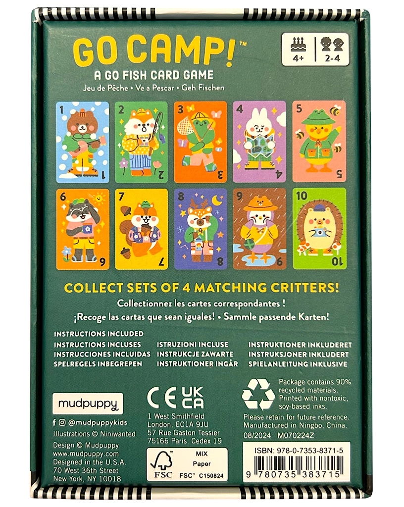 Ontdek kampeerplezier met het kaartspel Mudpuppy Laten we gaan kamperen. Dankzij de eenvoudige regels en prachtige illustraties is het leuk voor zowel kinderen als volwassenen. Het spel is compact en past perfect in de rugzak voor uitstapjes of voor regenachtige dagen thuis.