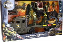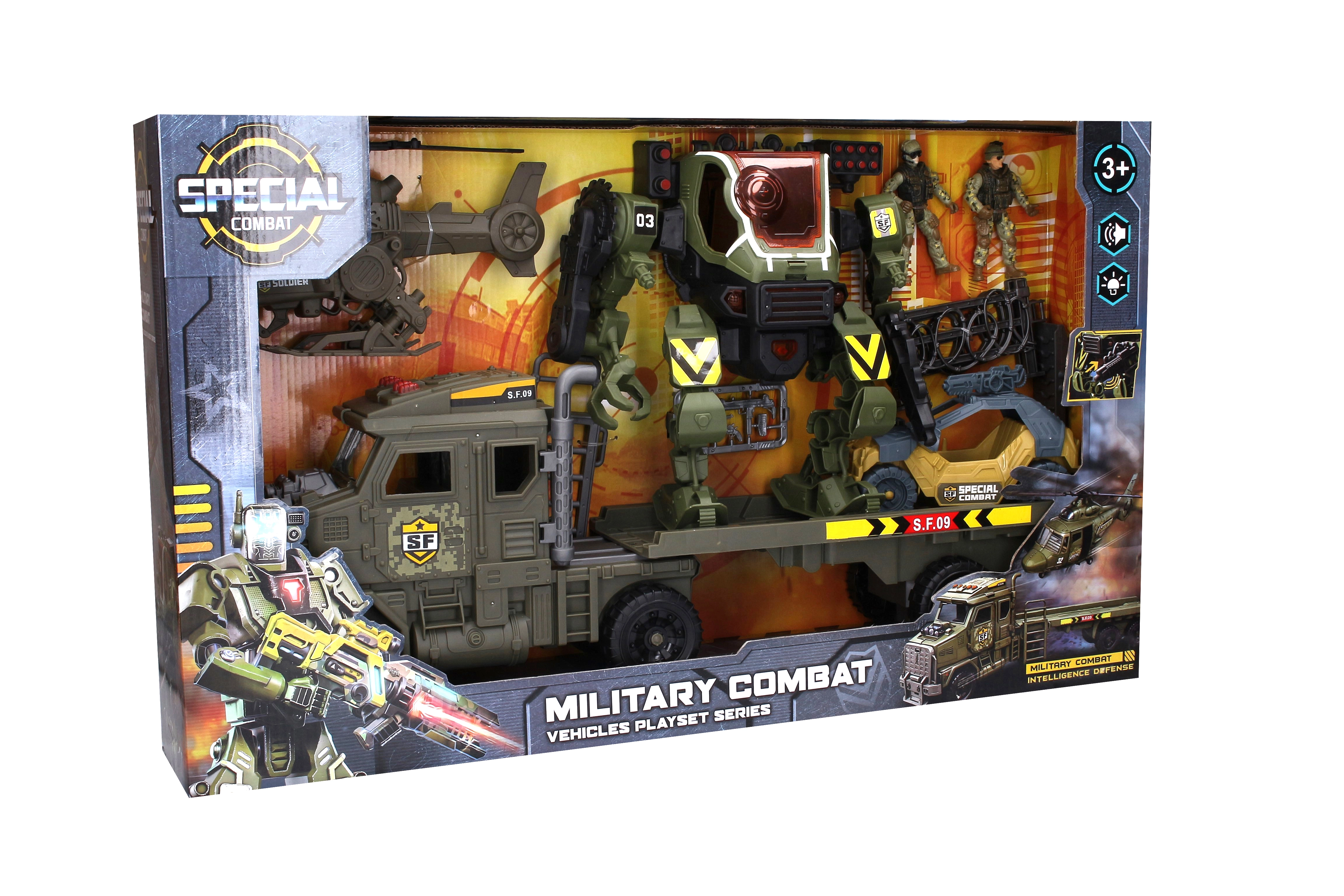 Onderdeel van de set is een robuuste militaire trekker (60 cm) met vrijlopende wielen, een gedetailleerde helikopter voor snelle verplaatsingen, een buggy met mitrailleur voor offensieve acties en twee pilotenfiguren. Ook inbegrepen is versterking en uitrusting voor soldaten, wat elke missie compleet maakt. De robot is direct klaar voor actie – batterijen zijn inbegrepen.