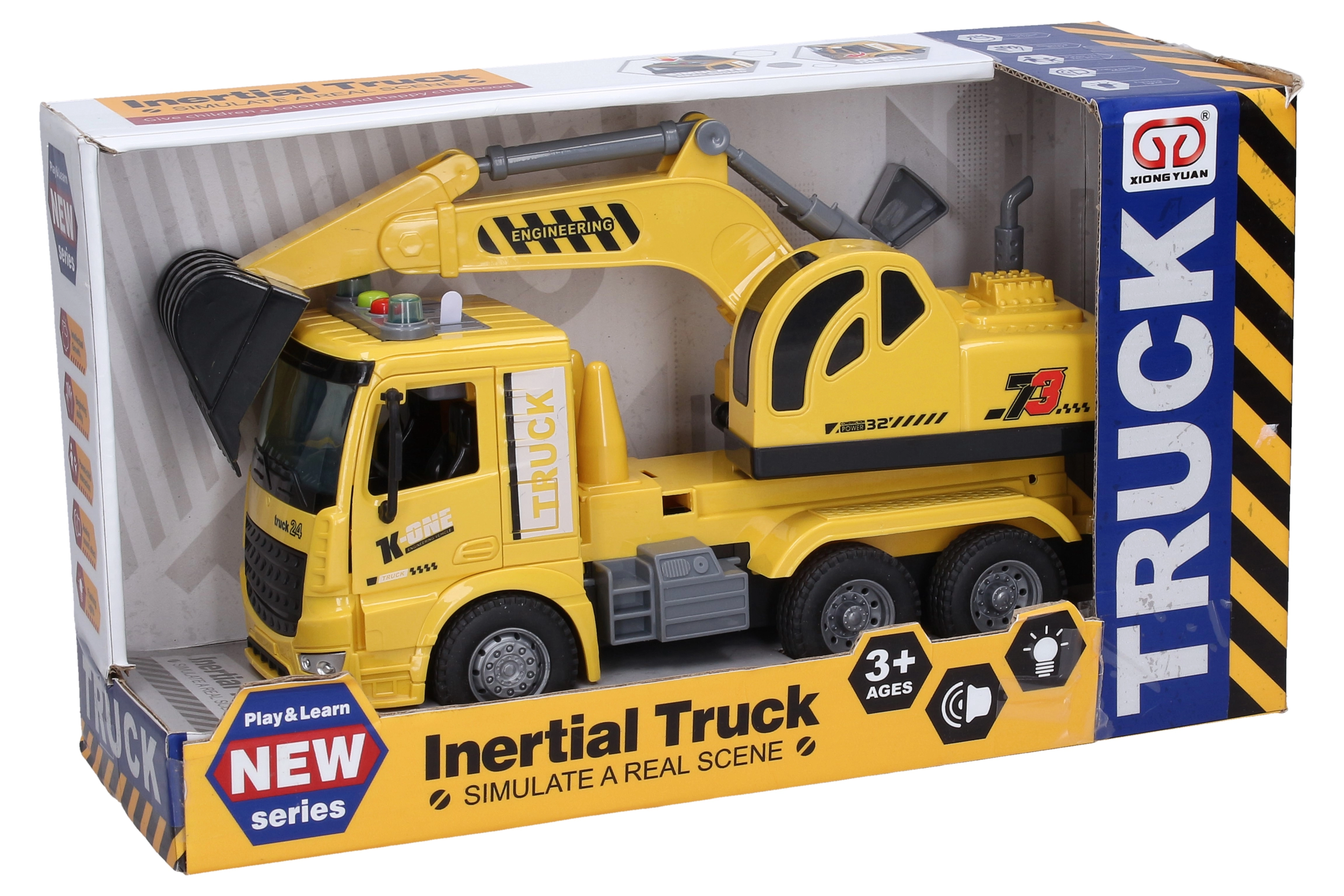 Deze gedetailleerde bouwgraafmachine van 28 cm is de ideale speelgoedkeuze voor alle jonge fans van bouwmachines. De vliegwielaandrijving zorgt voor soepel rijden, terwijl de knoppen op het dak realistische motor-, graaf-, achteruitrij- en toetergeluiden activeren, aangevuld met lichteffecten.
