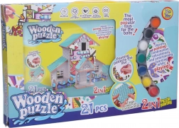 Ontdek creatieve fun voor kinderen en volwassenen: een 3D houten huisjespuzzel die je na het in elkaar zetten zelf kunt inkleuren. De set bevat alles wat je nodig hebt – precies passende houten onderdelen, verf, penseel en een geïllustreerde handleiding. Na montage heeft het huisje afmetingen van 13,2 × 9,1 × 10,5 cm.