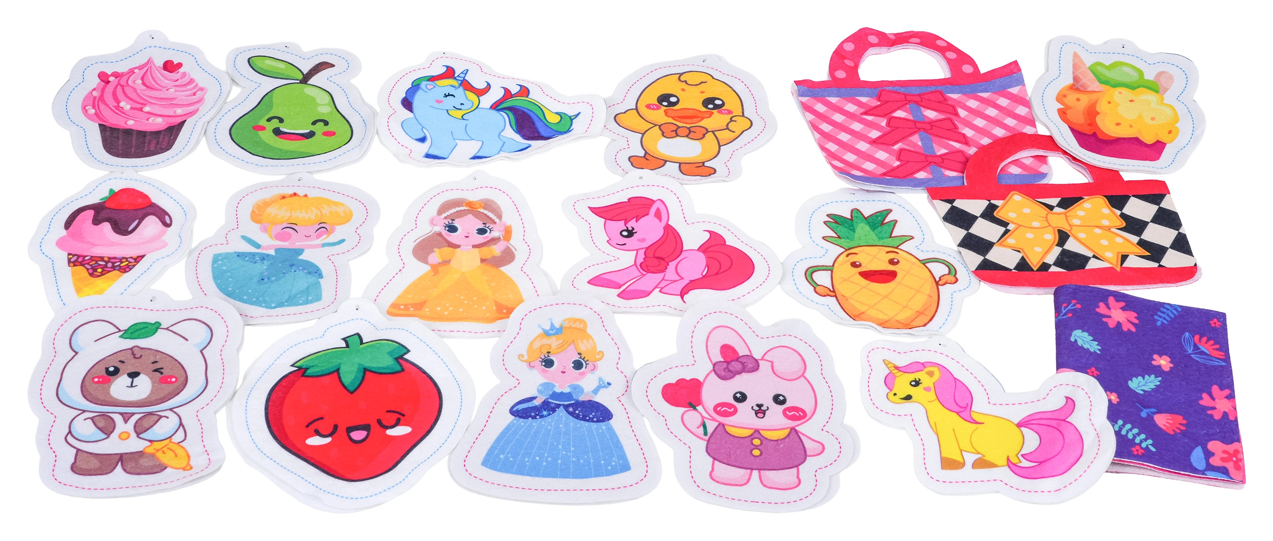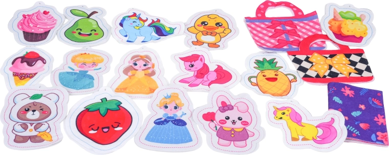 De set bevat vilten sjablonen voor tasjes, textiele onderdelen, sjablonen voor het maken van pluchen versieringen, vulling, kogelkettingen en een schaar – alles wat kinderen nodig hebben om hun eigen accessoires en schattige hangers te maken. Het spel bevordert coördinatievaardigheden, geduld en creativiteit.