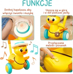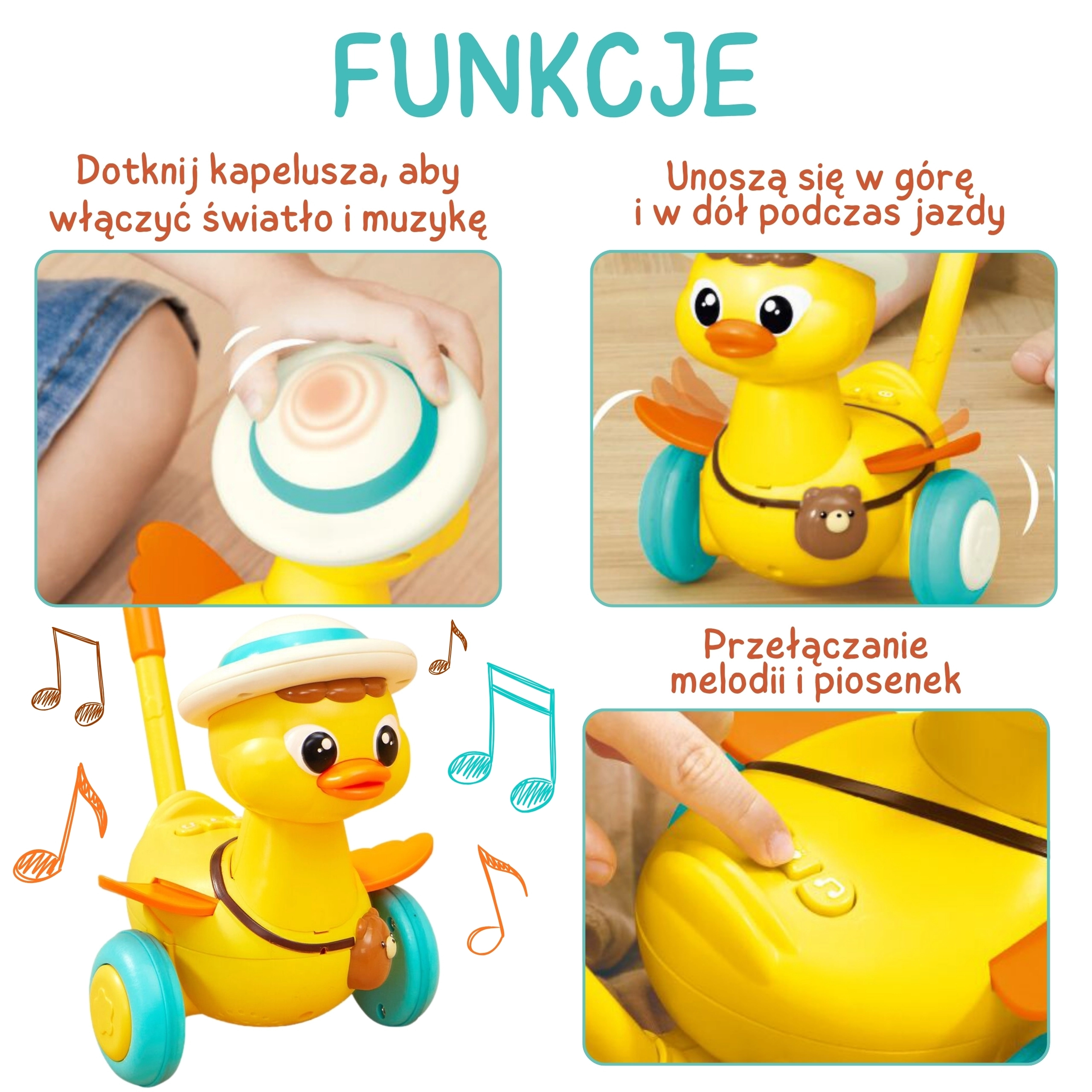 Het schattige eendje op een stok van het merk WOOPIE verandert de eerste stapjes in een leuk spel. Tijdens het rijden flappert het met de vleugeltjes, licht het op en speelt het vrolijke melodietjes af. Dankzij de lichte uitvoering, stabiele, brede wieltjes en eenvoudige bediening met knoppen zijn kinderen er meteen weg van. Een geweldige metgezel voor de ontwikkeling van motoriek en zelfstandigheid vanaf 18 maanden.