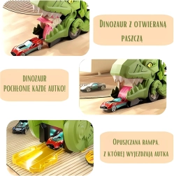 Ontdek de wereld van dinosaurussen en raceauto’s in één! Deze dinosaurus-vrachtwagen met ramp van WOOPIE dient als draagbare koffer met handgreep, opbergruimte en racebaan. Binnenin vind je 12 metalen autootjes die je kunt laten rijden via de opvouwbare afdalingsramp. Een openende bek, bewegende delen en duurzame, veilige materialen zorgen voor uren creatief speelplezier thuis en onderweg.