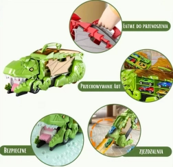 De dinosaurus-trekker verandert in een handomdraai in een actief speelveld: klap de oranje ramp uit, laad de autootjes op en laat ze vertrekken uit de open dinosaurusbek. Dankzij de praktische handgreep en de interne vakken berg je alle wagens makkelijk op en neem je ze overal mee. Levendige kleuren en opvallende details prikkelen de fantasie en nodigen uit tot spelen.