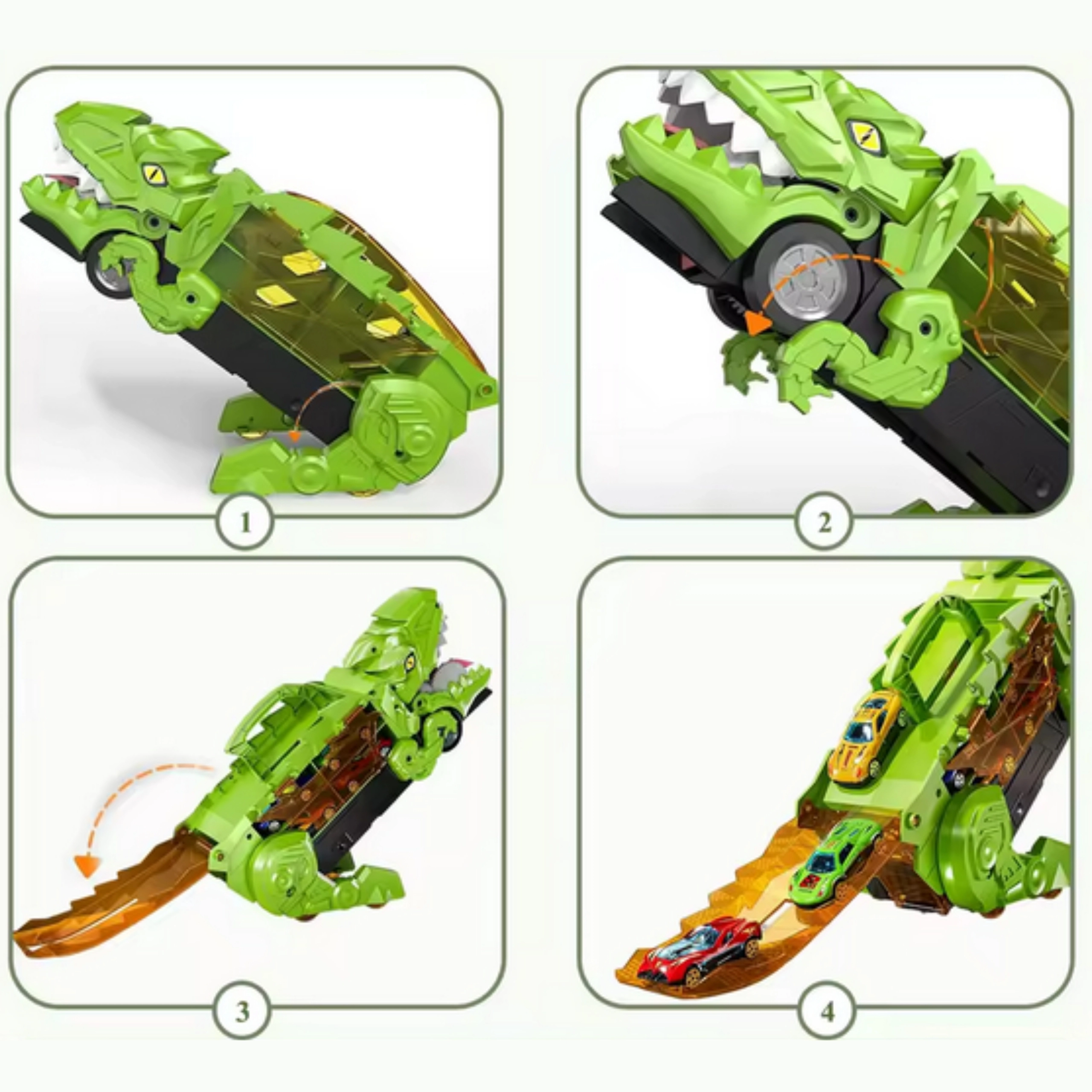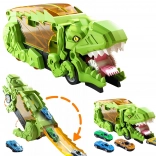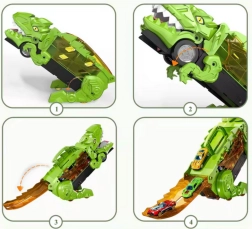 Open de dinosauruskop en laat de oranje glijbaan zakken. De autootjes rijden soepel naar buiten en de race kan beginnen.