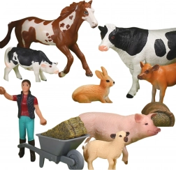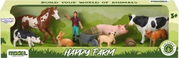 - paard (kastanjebruin met witte aftekening), koe (zwart-wit), kalf/koe (zwart-wit), kalf (roestbruin), varken (lichtroze), schaap/lam (licht), konijn (roestbruin), figuur van een boerin, kruiwagen, hooibaal