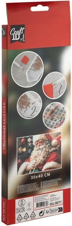 Ontdek ontspanning met de creatieve set voor diamond painting met het Kerstman-motief in het formaat 30 × 40 cm. In de verpakking vind je alles wat je nodig hebt – canvas, steentjes, pen, schaaltje en was. De eenvoudige plaktechniek zonder artistieke vaardigheden biedt plezier voor kinderen en volwassenen, en het eindresultaat kun je inlijsten (lijst niet inbegrepen).