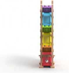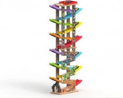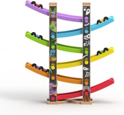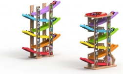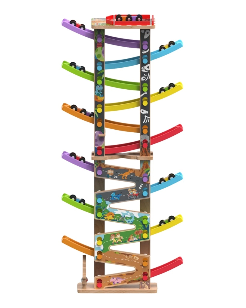 Deze grote houten racebaan brengt meer snelheid en plezier naar de kinderkamer. Dankzij zes kleurrijke hellingen volgen kinderen de vloeiende rit van de autootjes en ontdekken ze de principes van zwaartekracht en oorzaak-gevolg. Je kunt de baan geheel los gebruiken of als uitbreiding aansluiten op je bestaande set voor een nog langere en dynamischere rit.