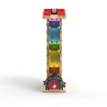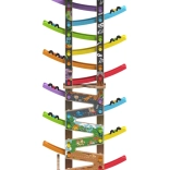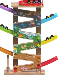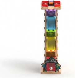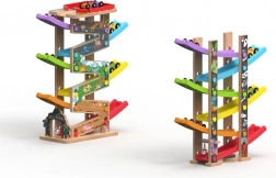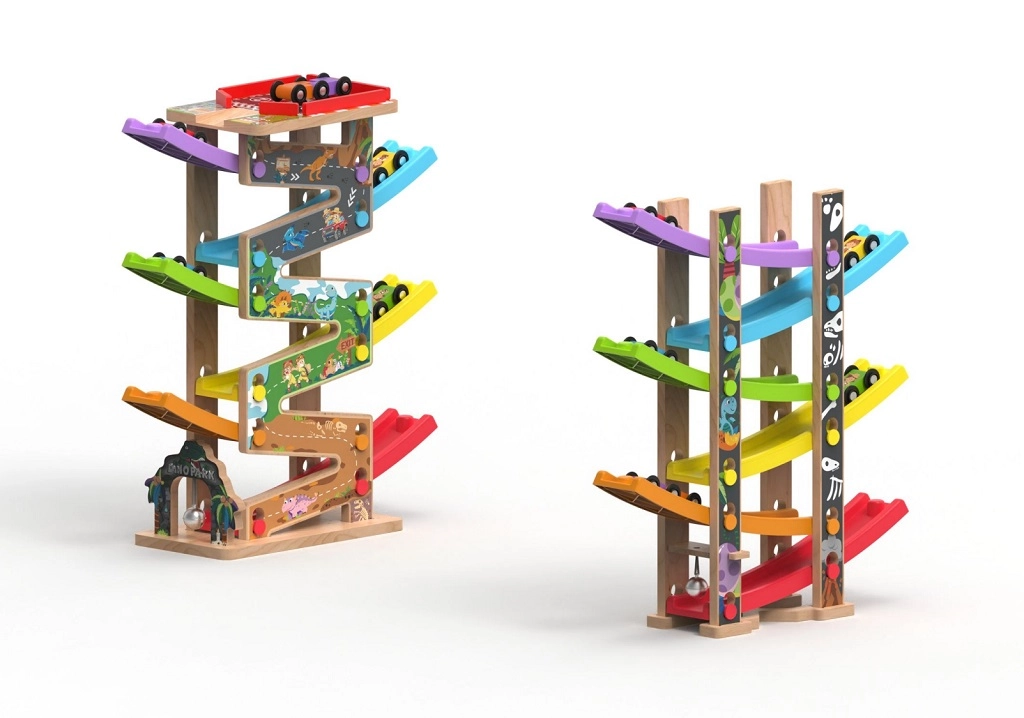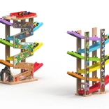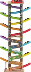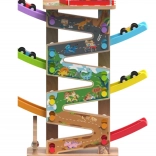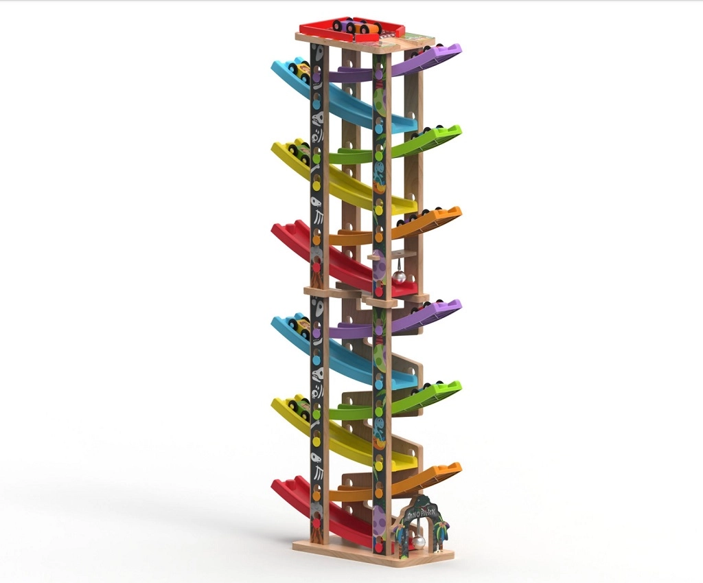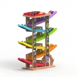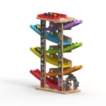 Deze verticale houten race-toren met 6 kleurrijke hellingen biedt dynamisch, zwaartekrachtgestuurd spel. Kinderen plaatsen een autootje bovenaan en kijken hoe het naar beneden zoeft via verschillende niveaus, bochten en bruggetjes. Dankzij de stabiele constructie en compacte afmetingen past de baan in de kinderkamer of speelruimte en doorstaat hij intensief gebruik.