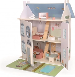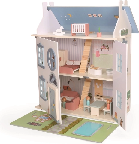 Dit tijdloze houten poppenhuis is ontworpen voor fantasierijk spel voor kinderen vanaf 3 jaar. Het biedt drie verdiepingen met ruime kamers – een moderne keuken, badkamer, knusse slaapkamer, woonkamer en een kinderkamer op zolder. Het voorste deel van het dak kan worden verwijderd, omgedraaid en voor het huis neergelegd, waardoor een tuin met zwembad en zitje ontstaat.