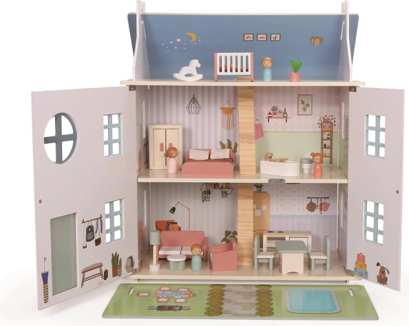 Het huis is gemaakt van hoogwaardig hout en aangevuld met textiele en vilten elementen. Meubels en figuurtjes zijn inbegrepen, zodat kinderen meteen kunnen spelen. Openklapbare panelen vergemakkelijken de toegang tot het interieur en de gedetailleerde kamerprints stimuleren realistisch spel. De robuuste constructie garandeert een lange levensduur en veilig gebruik.