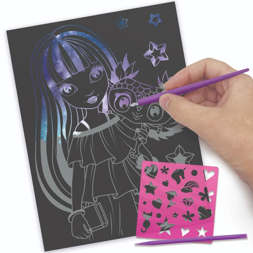 De NEBULOUS STARS krasset is ideaal voor de ontwikkeling van creativiteit, fijne motoriek en geduld. Kinderen onthullen met de meegeleverde tools kleurrijke motieven en creëren originele afbeeldingen aan de hand van sjablonen of hun eigen fantasie. Het verhaal van Isadora geeft het knutselen een magische sfeer.