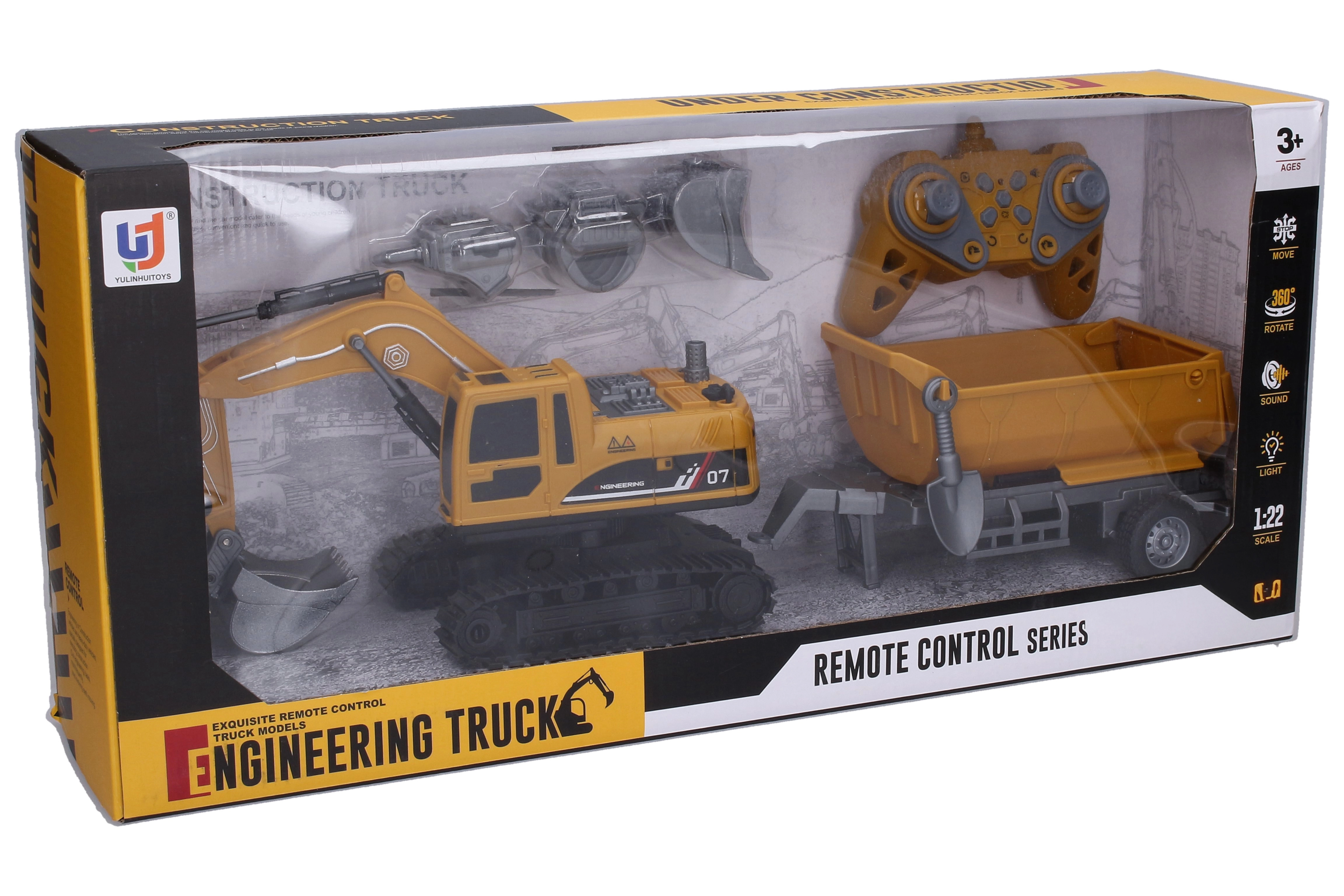Het model is uitgerust met licht- en geluidseffecten en bovendien een rookeffect met een watertank in het achterste deel van de graafmachine. De overzichtelijke controller biedt een demo-modus, torenrotatie links/rechts en precieze armbediening. In de verpakking zitten een oplaadbare batterij voor de graafmachine en een USB-oplaadkabel.