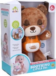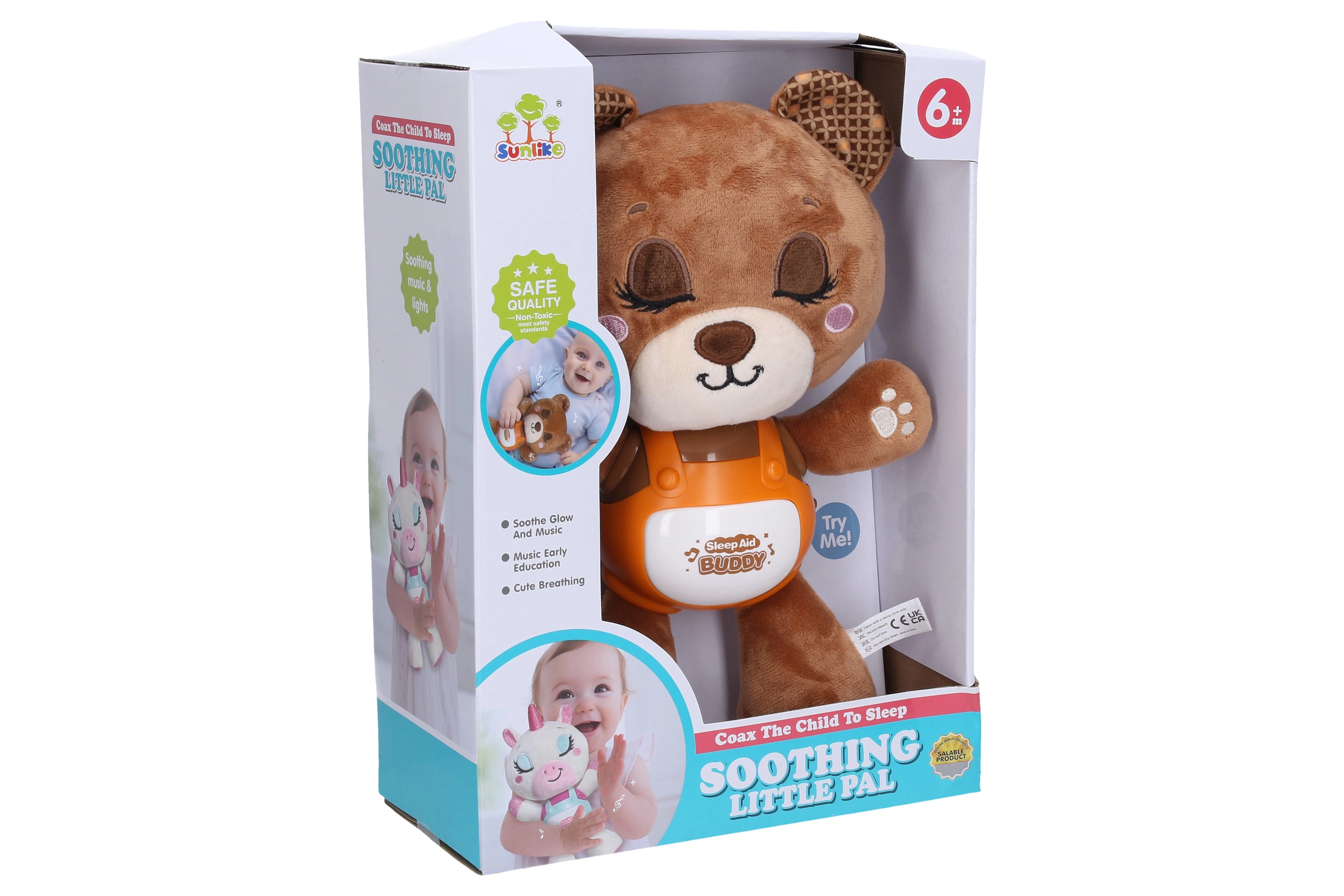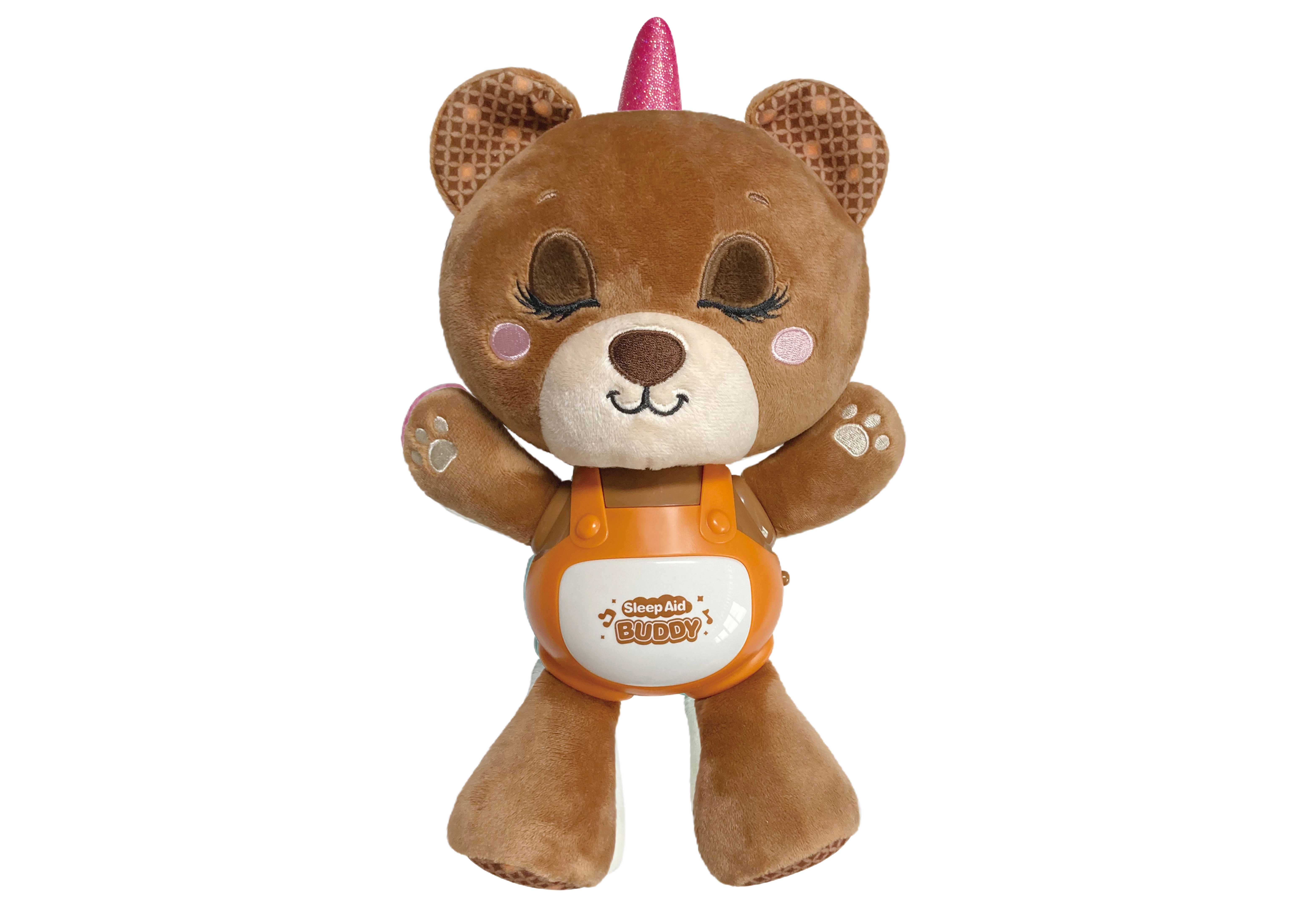 Een schattige slaaphulp in de vorm van een beer van 29 cm helpt kinderen rustig in slaap te vallen dankzij een combinatie van wiegeliedjes, kalmerende muziek, snurkgeluiden en een zacht nachtlampje. Bediening is eenvoudig – druk op het buikje om tussen de modi te schakelen. Een praktische aan/uit-schakelaar zit aan de zijkant.