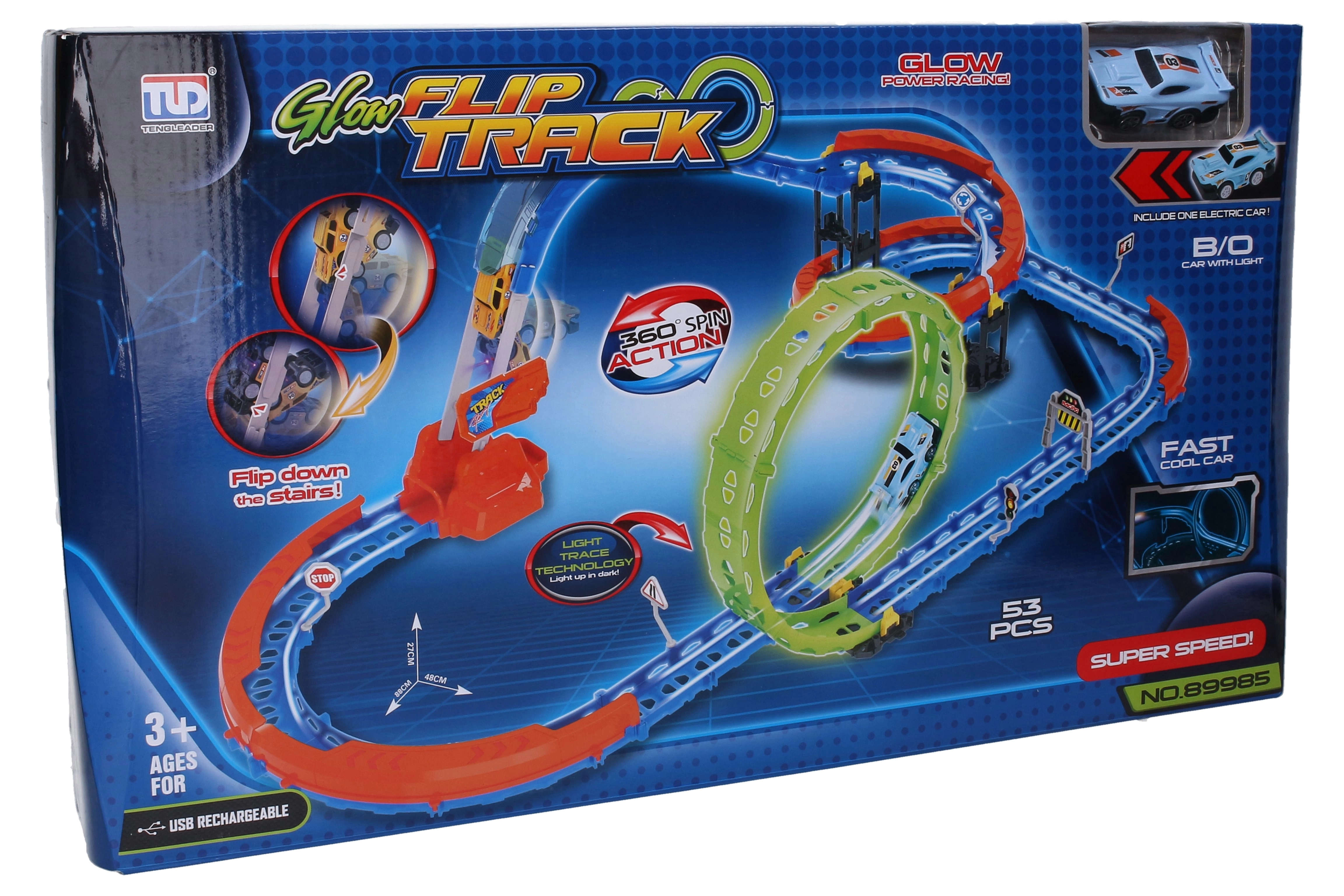Een leuke racebaan met een lichtgevend autootje biedt kinderen een rit vol actie en lichteffecten. De afmetingen van de gemonteerde baan zijn 88 × 27 × 48 cm en het autootje heeft een ingebouwde lithiumbatterij 3,7 V / 90 mAh met USB-opladen. Bediening is eenvoudig dankzij de aan/uit-schakelaar en de oplaadpoort aan de onderzijde van het voertuig.