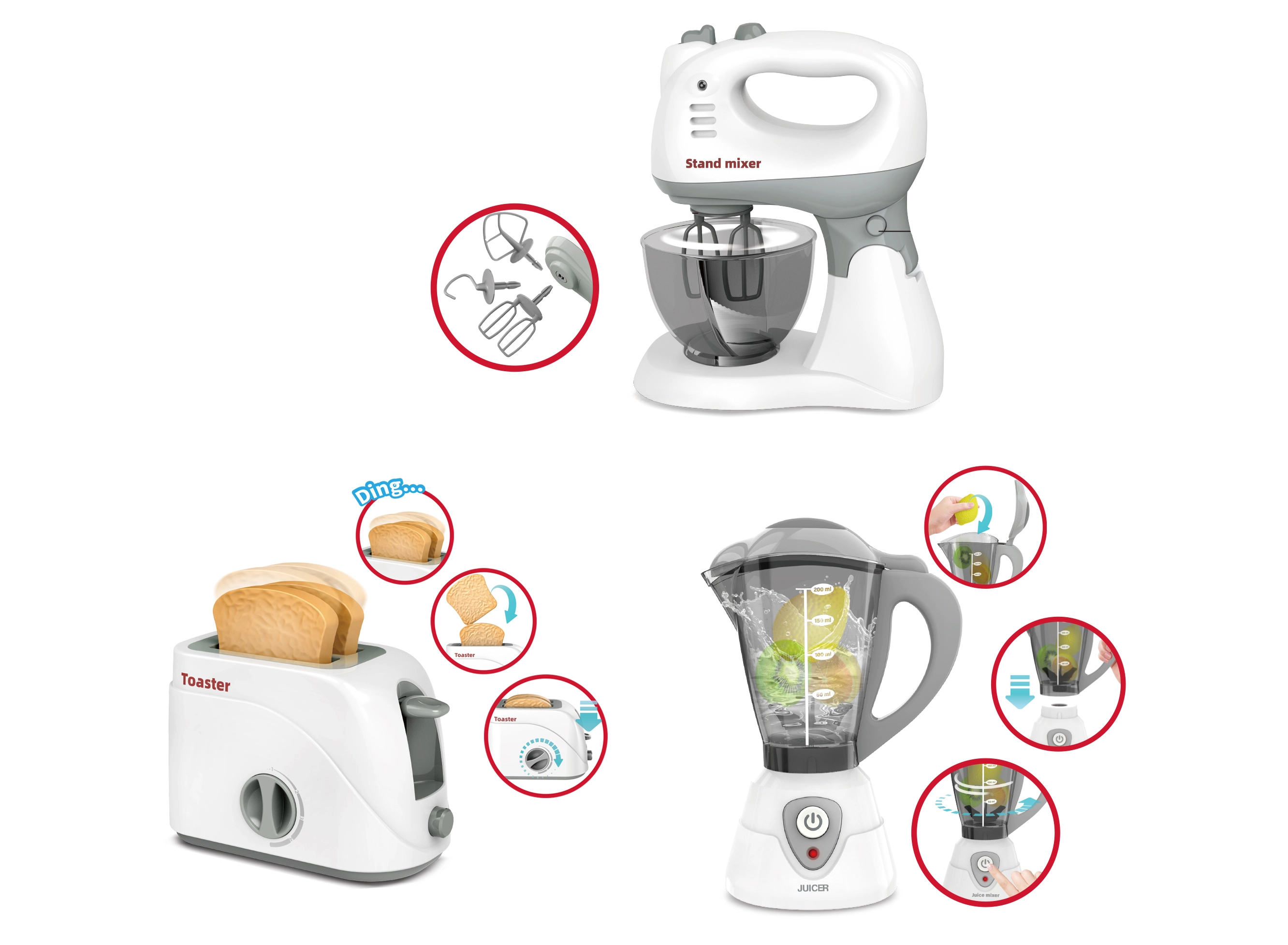 Ontdek de leuke kinder set keukenapparaten met realistische functies die kinderen de wereld van koken laten ervaren. De set bevat een blender met afneembare kan, een broodrooster met timer en een mixer met verwisselbare gardes. Lichteffecten en functionele elementen zoals aan/uit-schakelaars, uitspringende toasts en afneembare onderdelen zorgen voor urenlang veilig en creatief spel.
