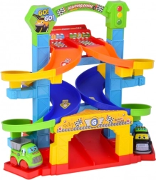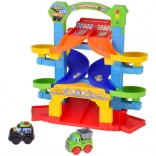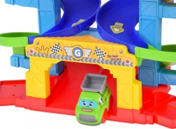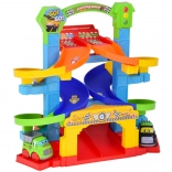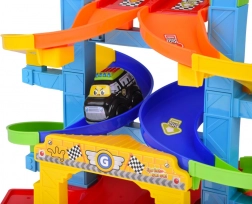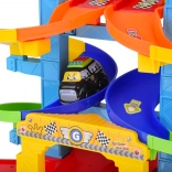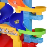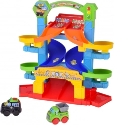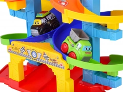 Kleurige, gedraaide banen leiden de autootjes veilig naar beneden. Stevige kolommen en brede randen zorgen voor een vloeiende rit zonder vastlopen.