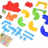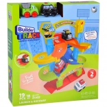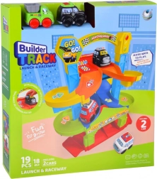 De baan is makkelijk te monteren en om te bouwen, zodat je de indeling en de kleuren van de segmenten naar wens kunt veranderen. Kwalitatieve, veilige materialen en afgeronde randen zijn geschikt voor de allerkleinsten. In de doos zitten twee autootjes – een politievoertuig en een groene kiepwagen, die soepel rijden over de brede hellingen.