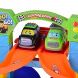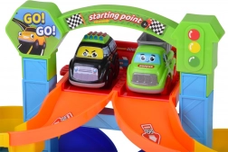 De dubbele starttoren met “starting point” en hendel laat twee autootjes tegelijk vertrekken. Kinderen beleven een spannende start en kunnen zij aan zij racen.