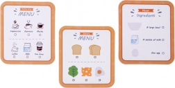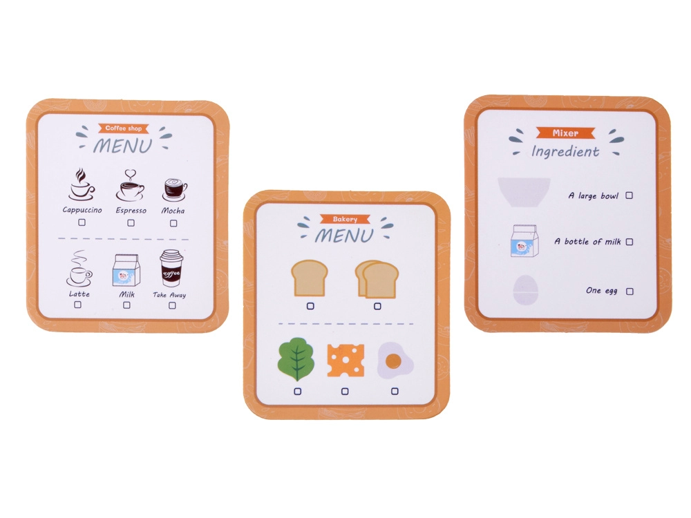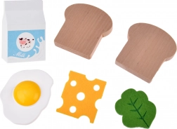 Inclusief rijk assortiment accessoires: houten sneetjes brood, een nep ei, een plak kaas, een blaadje sla, een melkpakje, een koffiecapsule en menu-/receptkaarten voor nog leuker spel.
