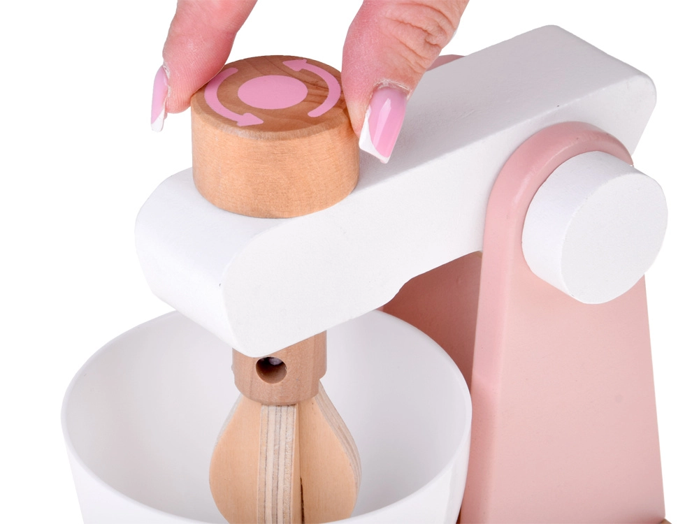 Stabiele houten constructie, afneembare kom en werkende draaiknop om het mixen van deeg of crème te simuleren. Ideaal voor kleine banketbakkers.