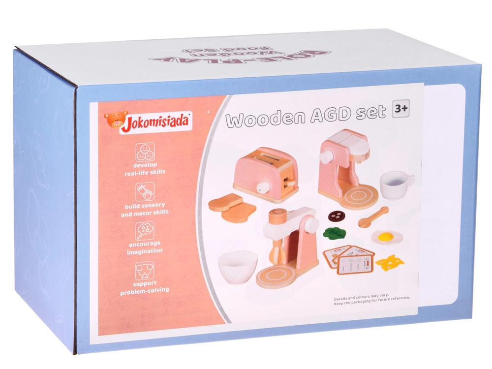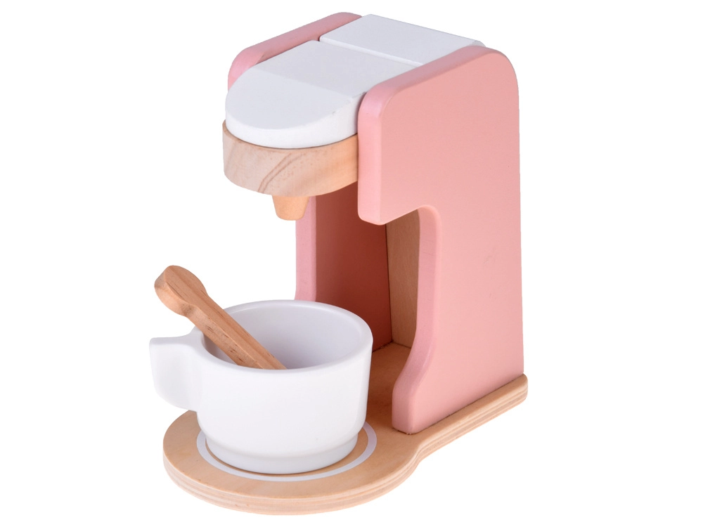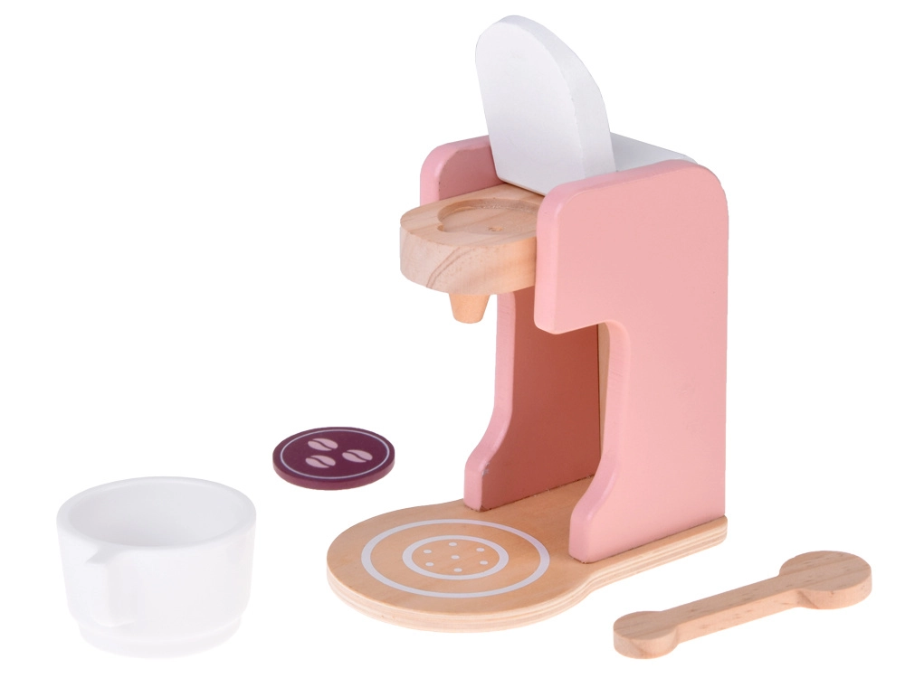 Een stijlvolle houten set klein huishoudelektro brengt de kinderkeuken naar een wereld vol fantasie. Bevat een broodrooster met hendel en draaiknop, een koffiezetapparaat met kopje, lepeltje en capsule en een staande mixer met kom en draaiende garde-opzet. Hoogwaardig natuurlijk hout, niet-giftige verven en een pastelkleurig design zorgen voor veilig en prachtig spel dat fijne motoriek, creativiteit en rollenspel stimuleert.