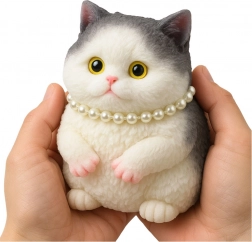 Schattig wit-grijs katje met parelketting, een zachte sensorische antistress squishy van elastisch siliconen. Het heeft een aangename, vachtachtige textuur, perfect om te knijpen, stress te verminderen en als stijlvolle decoratie op tafel of in de kast.