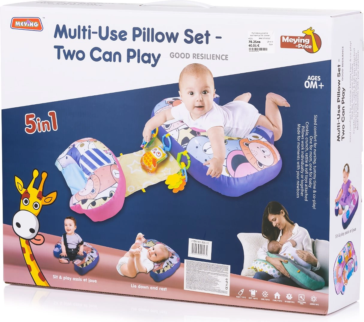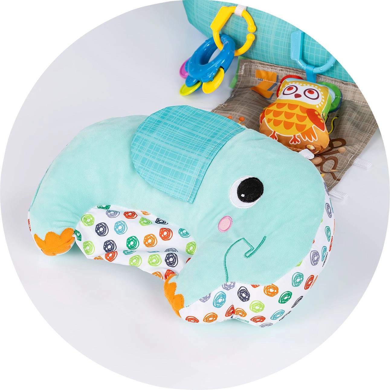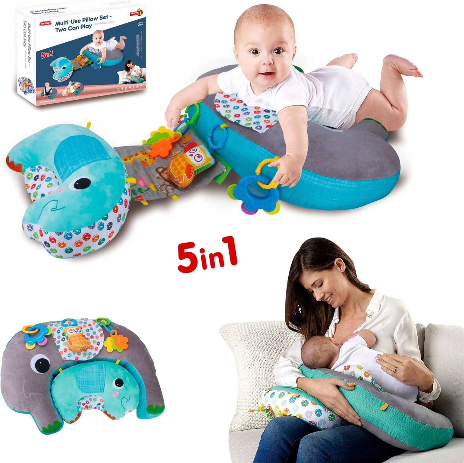 - 5‑in‑1 gebruik – steun op de buik, rugligging, ondersteuning bij zitten, ontspanning en speelse stimulatie.