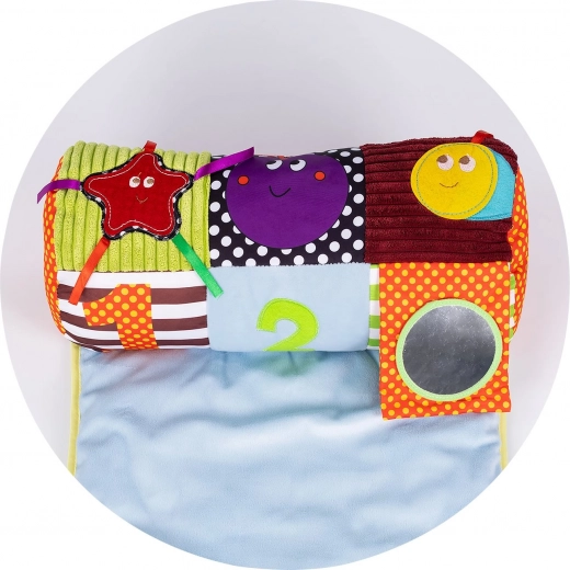 Contrasterende kleuren, texturen en kleine speeltjes ondersteunen de ontwikkeling van zicht, tast en coördinatie. Dankzij het lage gewicht is de set ideaal voor thuis en op reis – altijd klaar voor veilig spel en ontspanning.