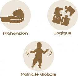Schuifkralen, tandwielen en andere interactieve onderdelen nodigen uit tot aanraken en ontdekken, waardoor oog-handcoördinatie en tastzin worden versterkt.