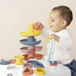 Kinderen zullen de kleurrijke elementen geweldig vinden: kralendoolhof, draaiende tandwielen, knikkertoren en vormensorteerder. Elke activiteit is ontworpen om motorische ontwikkeling, geduld en het begrip van oorzaak en gevolg te ondersteunen.
