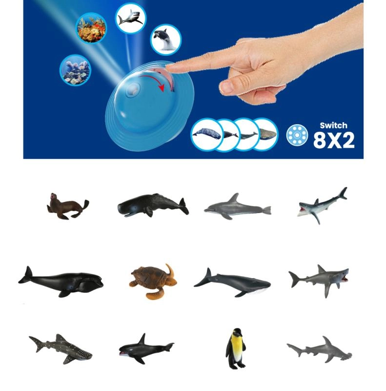De set combineert licht, kleuren en levensechte diermodellen, waardoor kinderen beelden gemakkelijk met de werkelijkheid verbinden. De projector met twee schijven projecteert zeemotieven op de muur of het plafond, die kinderen eenvoudig kunnen bekijken en die hen inspireren tot het vertellen van verhalen.