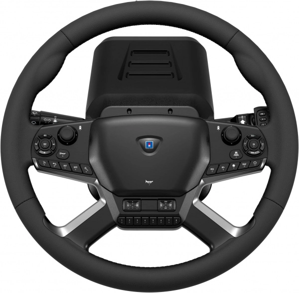 Het stuur met een diameter van 40 cm, bekleed met kunstleer en met 1800° stuuruitslag, levert een authentiek gevoel bij het rijden met zware vrachtwagens op de weg en in het depot.