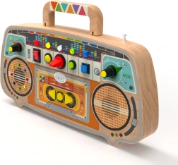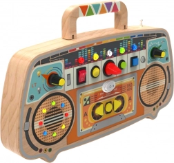 Dit originele houten activity board in retro-radio stijl combineert het echte luisteren naar FM-zenders met interactieve spelervaring. Kinderen kunnen aan knoppen draaien, hendels schakelen, schuivers bewegen en de gekleurde lichtjes van het LED-paneel volgen. Zo krijgen ze een stimulerende ervaring die hand-oogcoördinatie, muzikaal gehoor en de waarneming van kleuren en vormen ontwikkelt.