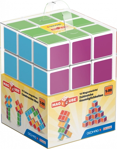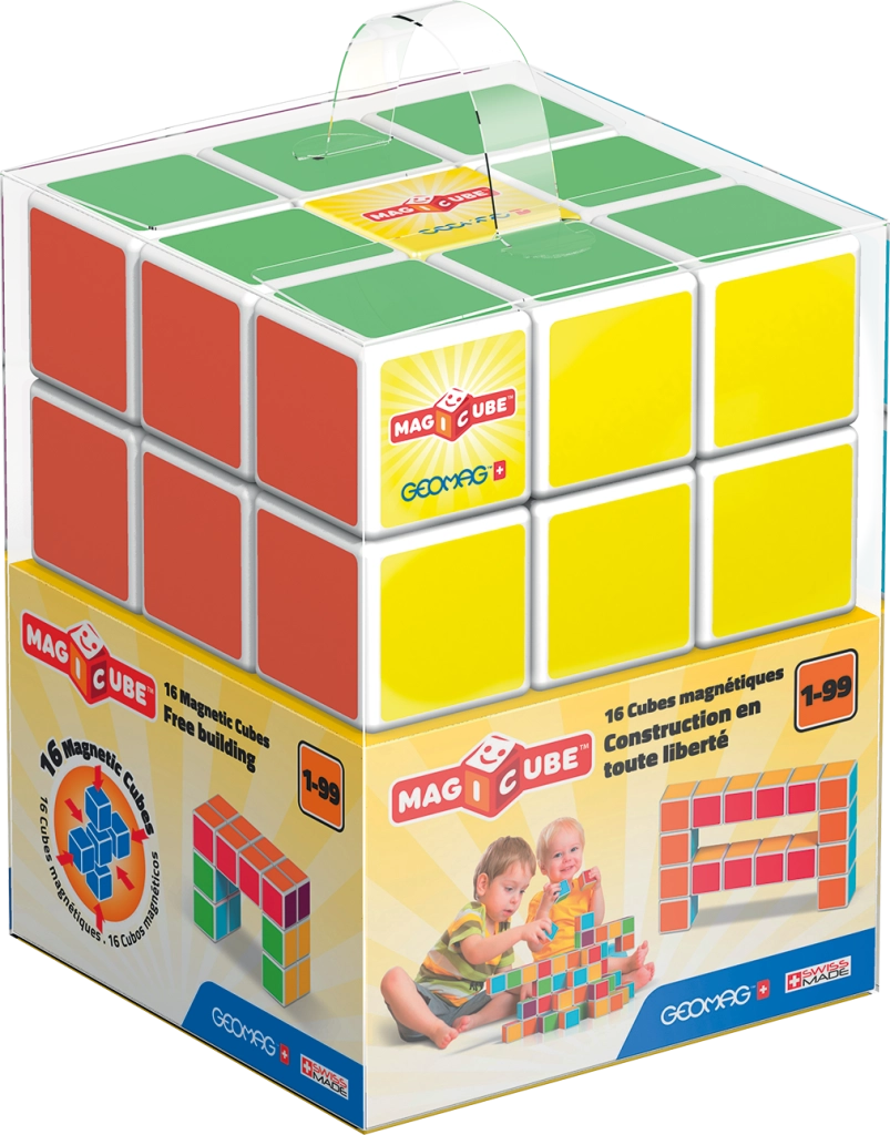 Bouw, ontdek en leer met de kleurrijke magnetische blokken van Geomag Magicube. Dankzij de unieke constructie trekken de blokken aan van alle kanten, bieden ze oneindige bouwmogelijkheden en stimuleren ze de fijne motoriek, ruimtelijke verbeelding en logisch denken. Elke zijde heeft een andere kleur, waardoor de blokken een geweldige educatieve tool zijn voor thuis en op school. De set bevat 16 magnetische blokken die in Zwitserland zijn gemaakt van gerecycled plastic, geschikt vanaf 1 jaar.