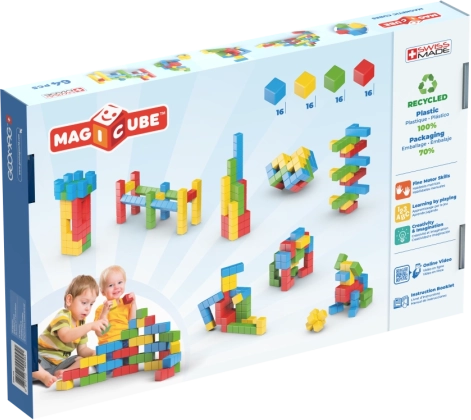 Ontdek 3D-creativiteit met de magnetische blokken GEOMAG MAGICUBE. Dankzij de speciale interne constructie trekken de blokken aan op alle zes de zijden, blijven ze stevig zitten zelfs in de lucht en maken ze eenvoudig en veilig bouwen mogelijk vanaf 1 jaar. De verpakking bevat 64 blokken in vier kleuren van 100% gerecycled plastic, gemaakt in Zwitserland.
